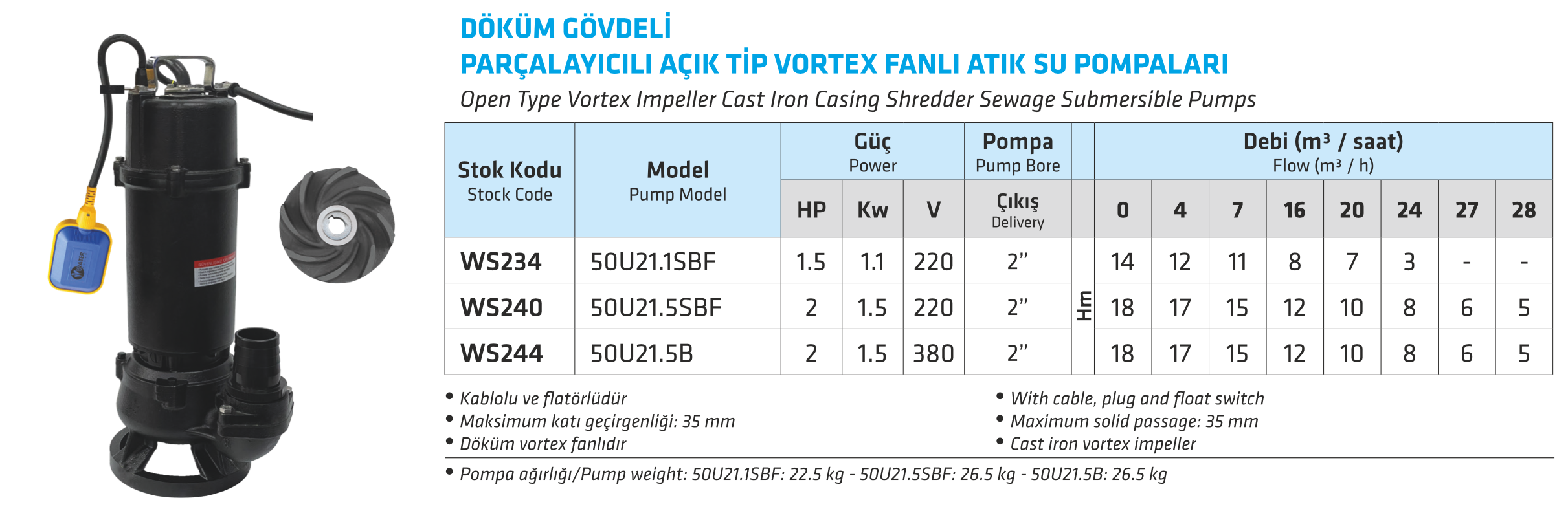 Döküm Gövdeli Parçalayıcılı Yarı Açık Tip Vortex Fanlı Atık Su Pompaları