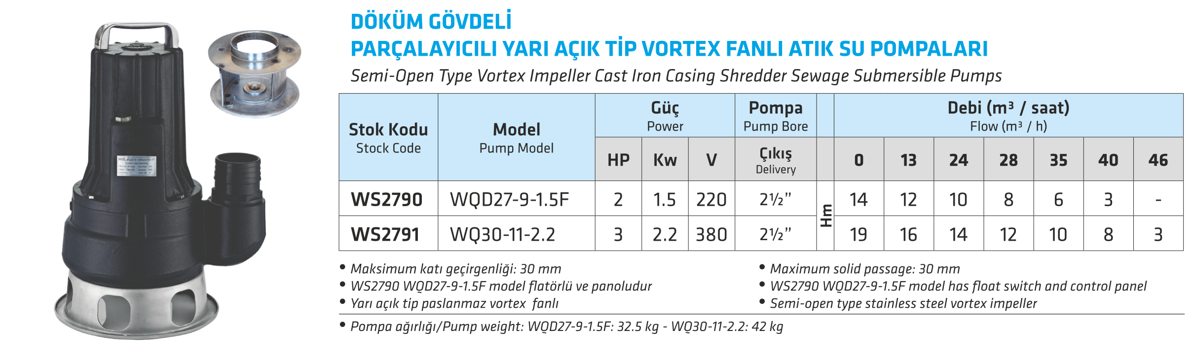 Döküm Gövdeli Parçalayıcılı Yarı Açık Tip Vortex Fanlı Atık Su Pompaları
