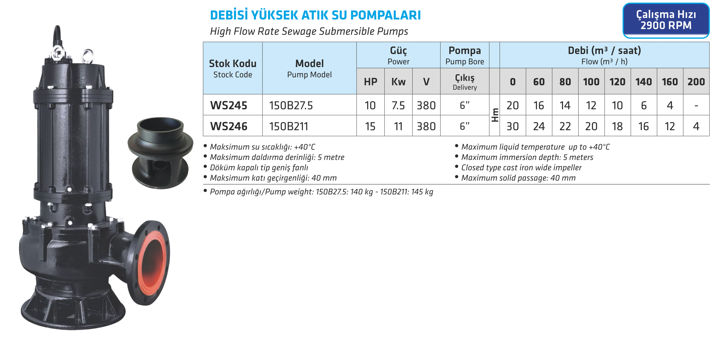Döküm Gövdeli Yüksek Debili Atık Su Pompaları