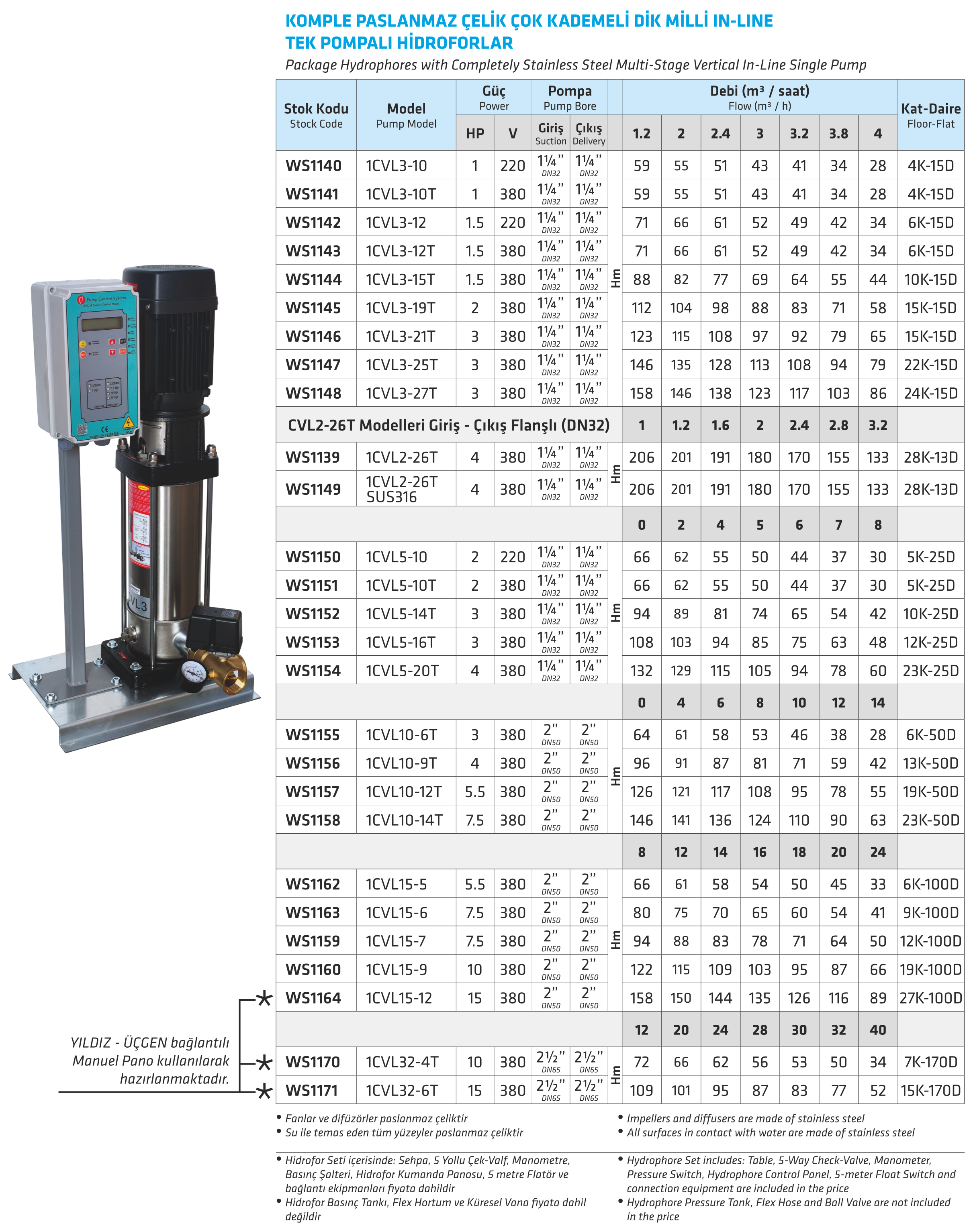 KOMPLE PASLANMAZ ÇELİK ÇOK KADEMELİ DİK MİLLİ IN-LINE TEK POMPALI HİDROFORLAR