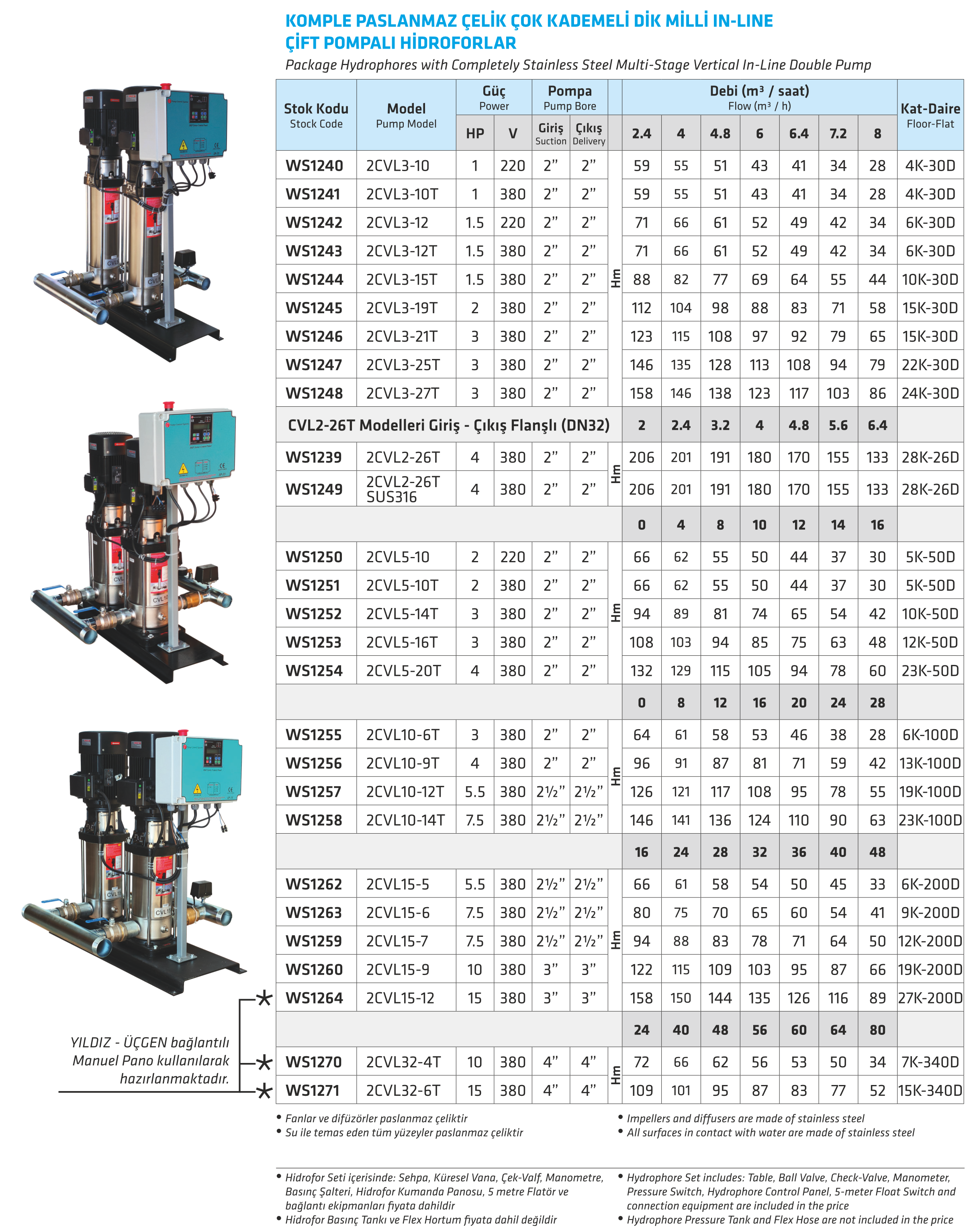 KOMPLE PASLANMAZ ÇELİK ÇOK KADEMELİ DİK MİLLİ IN-LINE ÇİFT POMPALI HİDROFORLAR