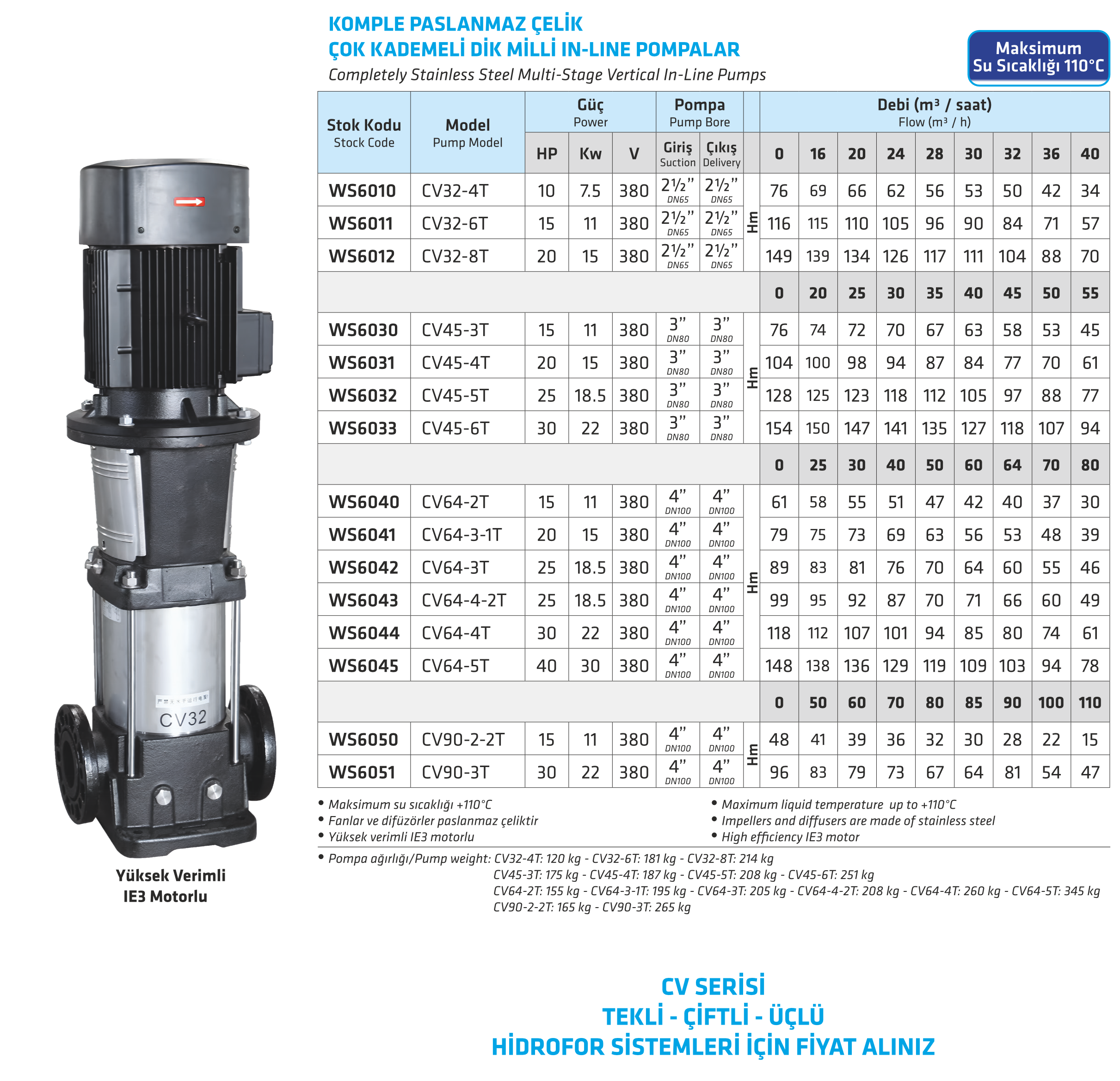 KOMPLE PASLANMAZ ÇELİK ÇOK KADEMELİ DİK MİLLİ IN-LINE POMPALAR
