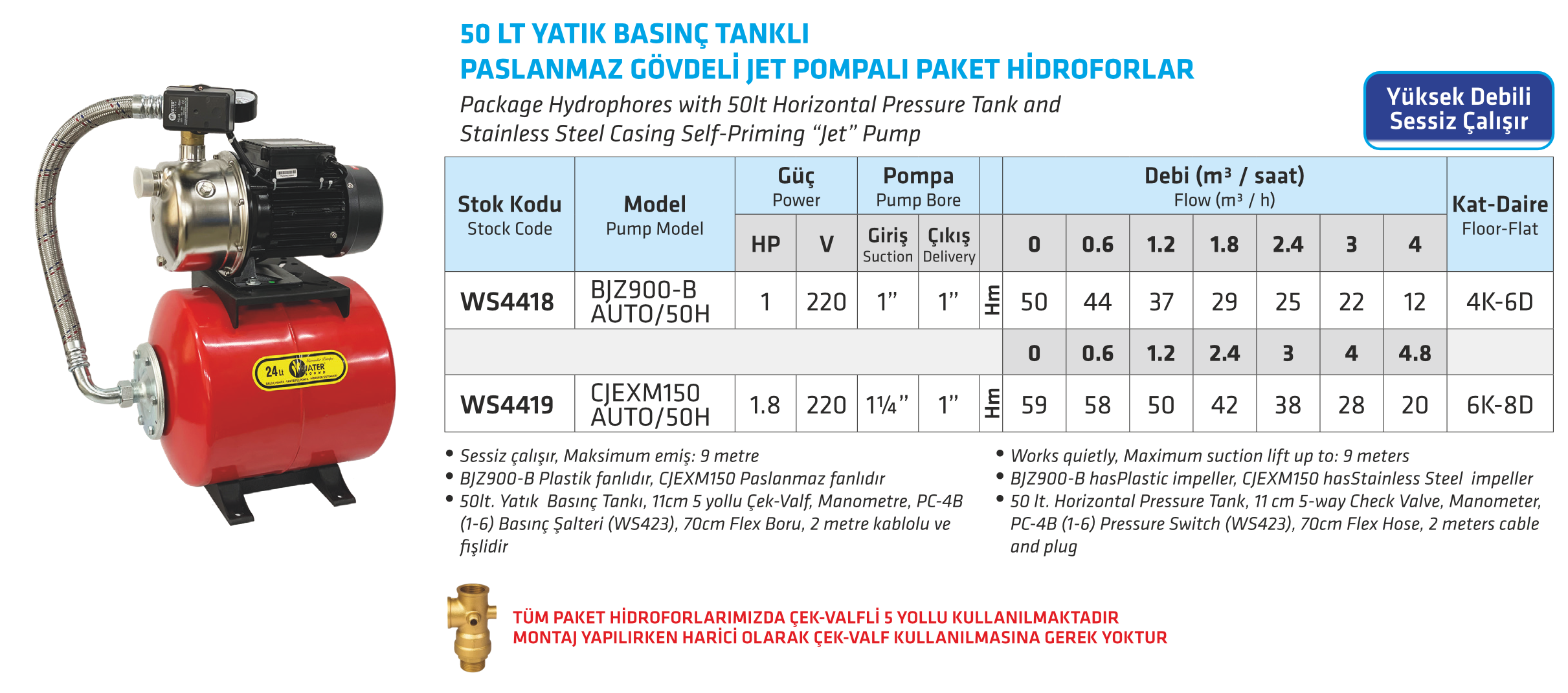 50 LT YATIK BASINÇ TANKLI PASLANMAZ GÖVDELİ JET POMPALI PAKET HİDROFORLAR