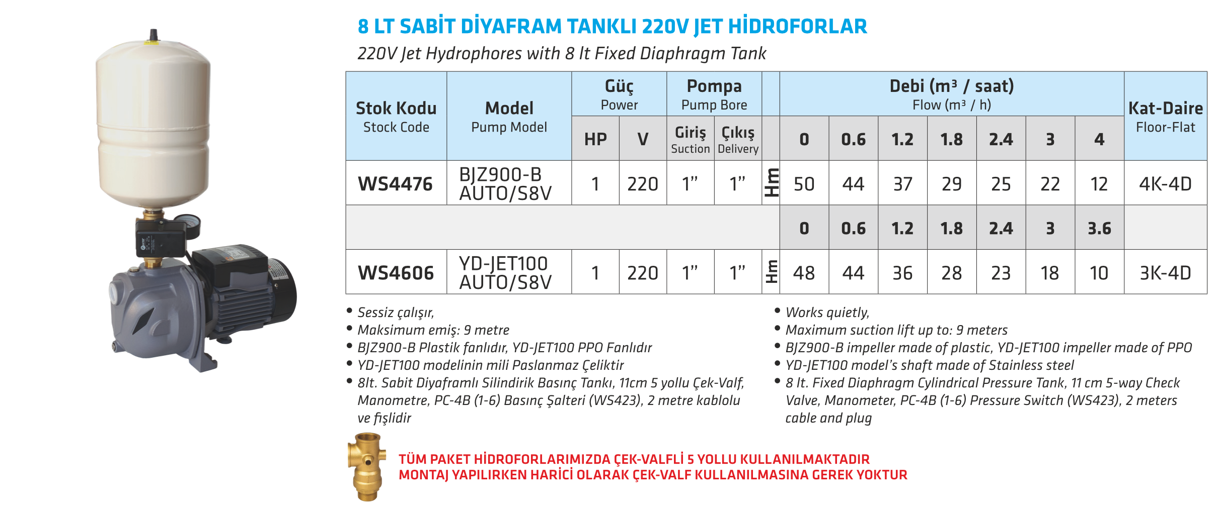 8 LT SABİT DİYAFRAM TANKLI 220V JET HİDROFORLAR
