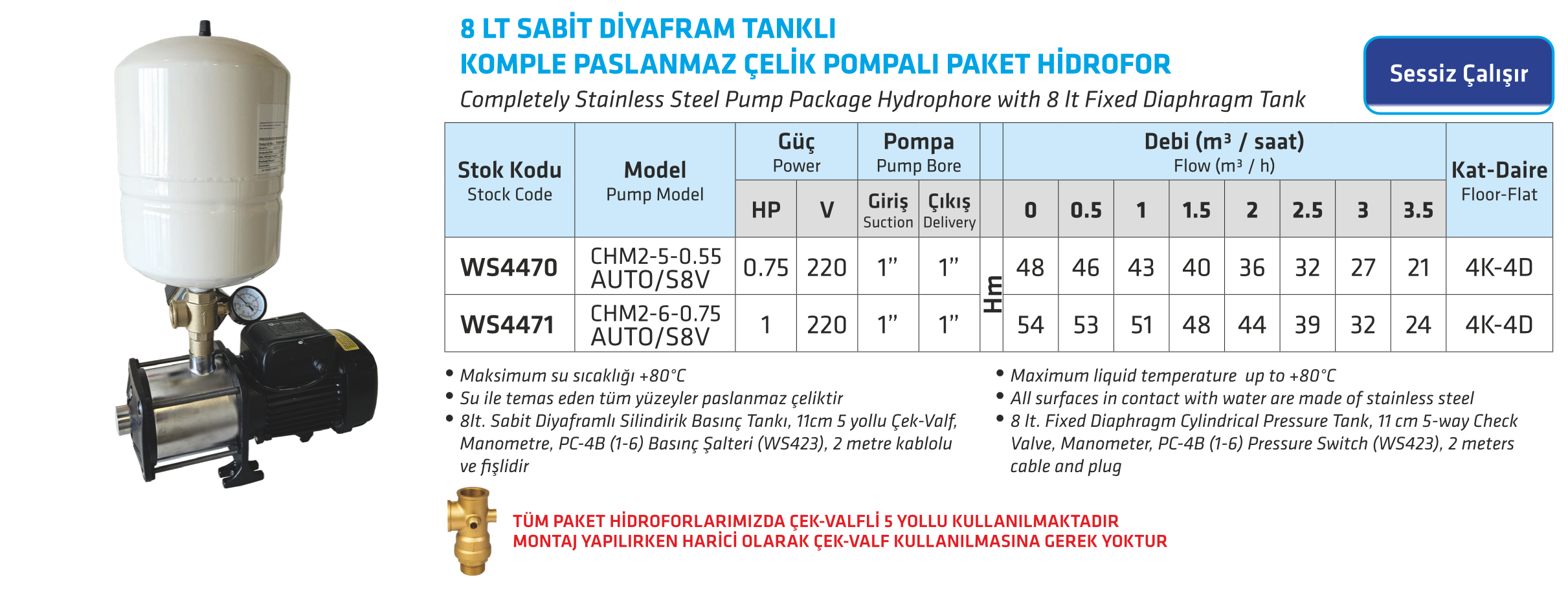 8 LT SABİT DİYAFRAM TANKLI KOMPLE PASLANMAZ ÇELİK POMPALI PAKET HİDROFOR