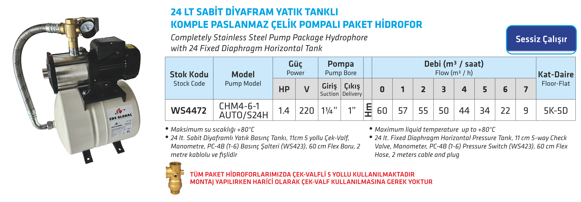 24 Lt Sabit Diyafram Yatık Tanklı Komple Paslanmaz Çelik Pompalı Paket Hidrofor