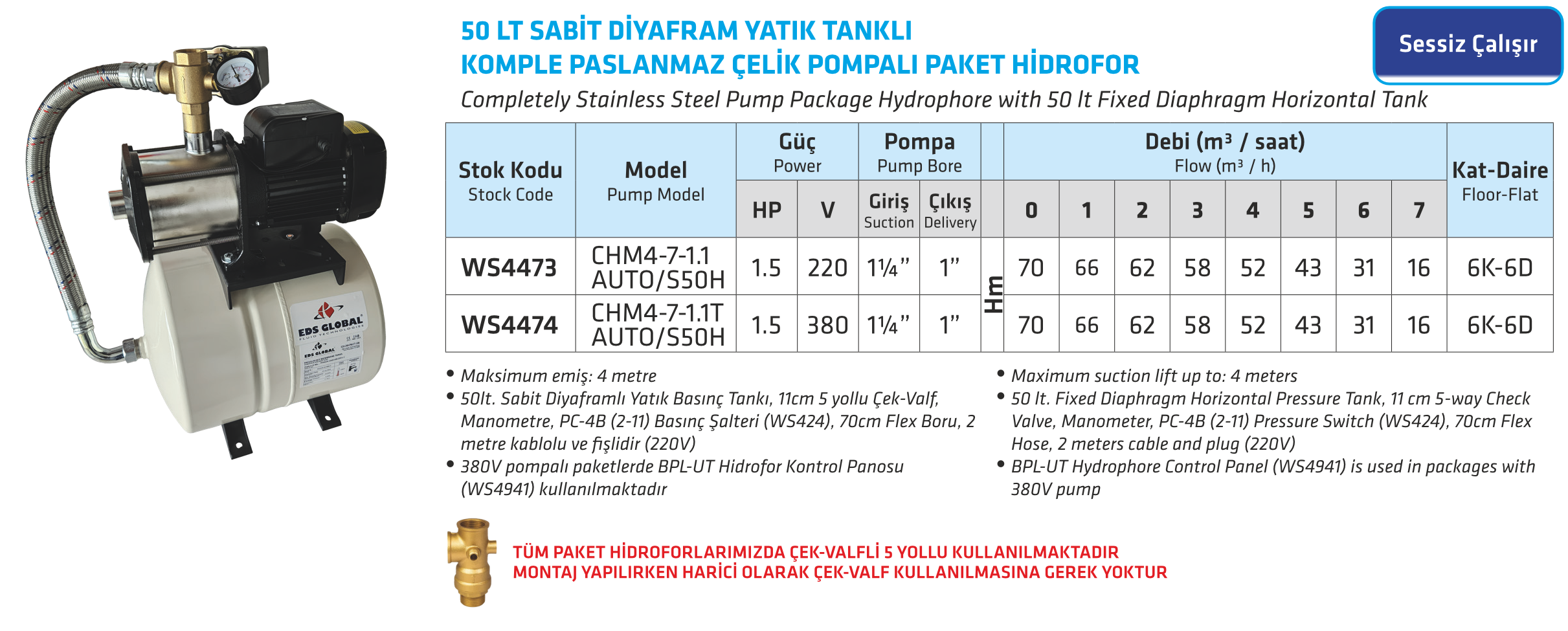 50 Lt Sabit Diyafram Yatık Tanklı Komple Paslanmaz Çelik Pompalı Paket Hidrofor